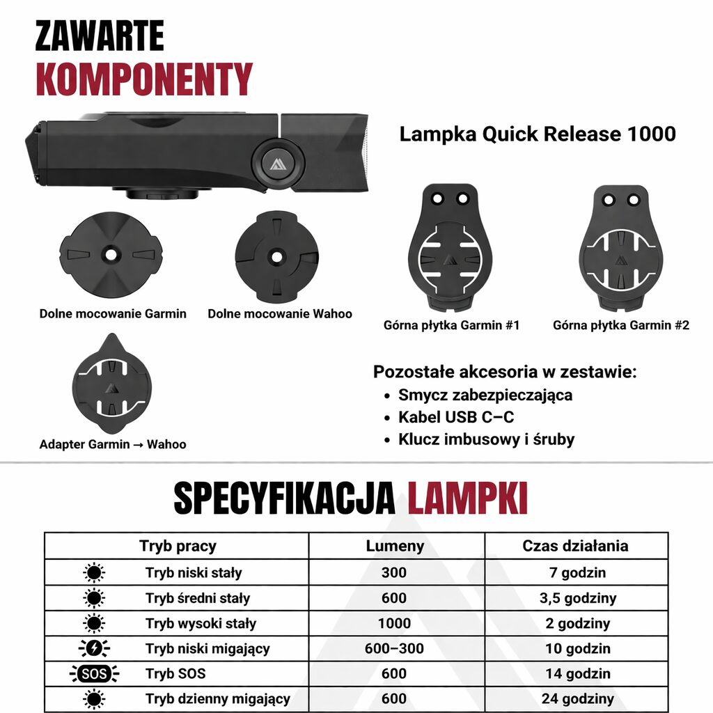 - Problem: niewygodny montaż i trudność ze zdjęciem lampki. Rozwiązanie: szybkie mocowanie Quick Release bez wysiłku.